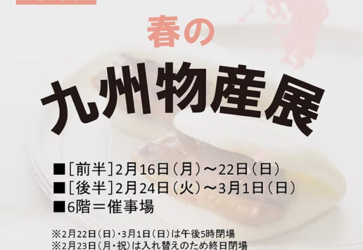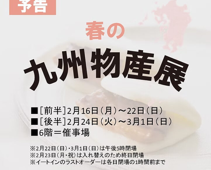 第83回 春の九州物産展 ■[前半]2月16日(月)~22日(日) ■[後半]2月24日(火)~3月1日(日) ■そごう 千葉店6階=催事場 ※2月22日(日)・3月1日(日)は午後5時閉場 ※2月23日(月・祝)は入...